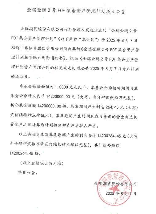 金瑞金鹏2号FOF集合资产管理计划成立公告