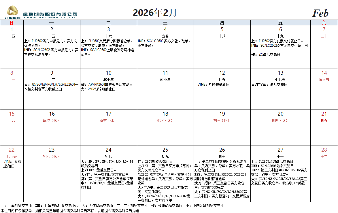 交割日历(2026年2月)