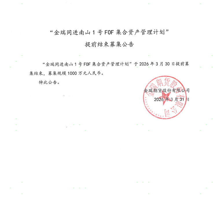 “金瑞同进南山1号FOF集合资产管理计划”提前结束募集公告